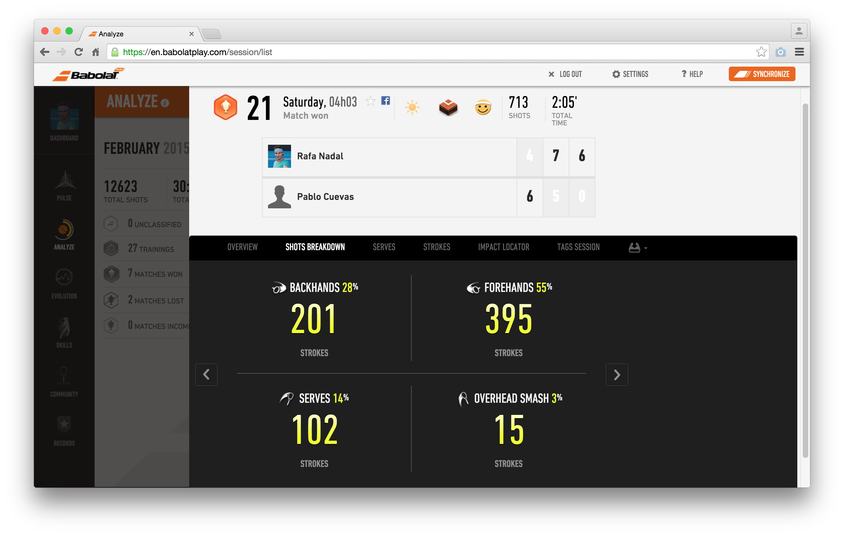 Análisis técnico/táctico : En tenis es importante dominar todos los golpes para poder cambiar el propio juego en función del adversario. Si no has empleado muchos golpes liftados, esto significa que tu juego es demasiado plano. Quizás tendrías que modificar ligeramente la forma en que sostienes la raqueta, o tu técnica, para imprimirle más aceleración a la pelota y darle así más «peso». Si efectúas pocos golpes cortados, intenta variar un poco tu juego para lanzar pelotas más bajas y sorprender a tu rival. Si has utilizado pocos golpes planos, deberías intentar dar mejor proyección a la pelota para imprimirle mayor velocidad, lo cual sorprenderá a tu adversario. Prueba también a variar más la proporción entre drives y reveses. La función «Skills» te proporcionará una buena perspectiva de tu dominio de los diferentes tipos de golpes.