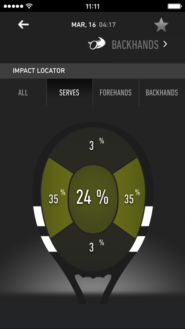 Análisis técnico/táctico : El «Impact Locator» es una herramienta importante para evaluar tu juego. Si obtienes un porcentaje elevado de impactos hacia la parte inferior del tamiz, es probable que estés demasiado cerca de la pelota, o que golpees por detrás de ti mismo. Si tienes un porcentaje elevado de impactos en la parte superior de la raqueta, quizás estés algo lejos de la pelota y te falte un paso en tu juego de piernas. Si tienes un alto porcentaje en la derecha o la izquierda, esto podría ser consecuencia del efecto que le das a la pelota, pero también podría indicar que no miras la pelota el tiempo suficiente para golpear en el centro del tamiz. Finalmente, si sirves con un gesto muy rápido, el punto de impacto en el tamiz que le dará a tus golpes el mejor rendimiento (velocidad de la pelota y ángulo óptimo para alcanzar la caja de servicio) está situado un poco por encima del centro del tamiz. En este caso, hay que tener un porcentaje elevado de impactos en la parte superior de la raqueta.