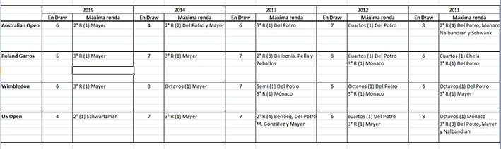 En el mismo período, pero con mayor concurrencia de jugadores argentinos, ya se había quedado sin argentinos en la misma ronda el Australian Open 2011, ’14 y ’15, Roland Garros 2013 y el US Open en la misma temporada.