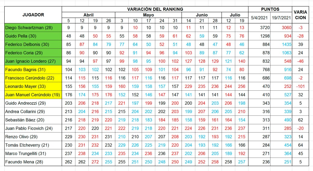 El resto, y en general, tuvo mucha variación, la mayoría para mejorar y sólo 6 de los 17 que comenzaron entre los 300 mejores bajaron en el ranking. De esos, cuatro fueron bastante bruscos. Los más notorios fueron Guido Pella (-28 posiciones), que terminó alejado de los 50 mejores, Juani Londero (-46), que salió de los 100, y Leonardo Mayer (-101).