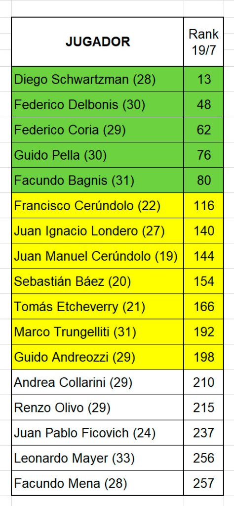 Los que más provecho le pudieron sacar a esta parte del año fueron Federico Delbonis (+39 posiciones), Facundo Bagnis (+24), Sebastián Báez (+62), Tommy Etcheverry (+64), Marcos Trungelliti (+45), Juanma Cerúndolo (+32) y, de arremetida, Federico Coria (+24), con su final en Bastad. Estos movimientos les permitieron saltar franjas o superar barreras, como Bagnis el Top 100, Báez y Etcheverry el Top 200 y a Delbonis, la valla de los 50 mejores.