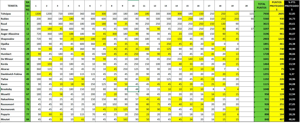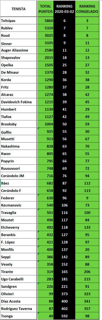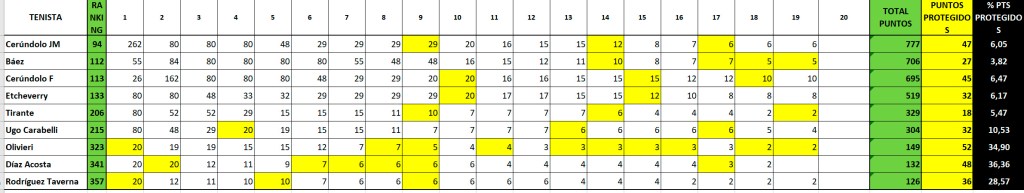 En los cuadros, y a modo de referencia, puede verse a cada jugador con los puntos que ha acumulado en el llamado «Ranking Congelado», destacando en amarillo los puntos acumulados vencidos, pero «frozen». En verde, la sumatoria total (también la posición que ocupa en ese ranking y en negro se destaca el porcentaje de incidencia de esos puntos congelados en el total del acumulado (Recuadro 1).
