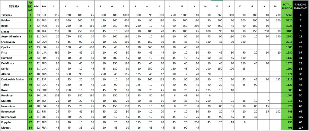 Sólo los cracks o aquellos que «ligaron» varios wildcards en los torneos importantes o quienes comenzaron compitiendo muy jóvenes (como Auger Aliassime) que ya venían acumulando puntos en certámenes ATP desde 2019.
